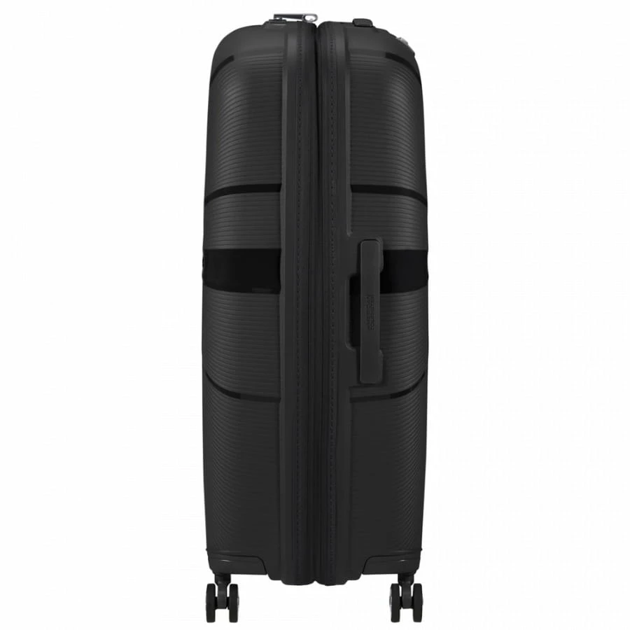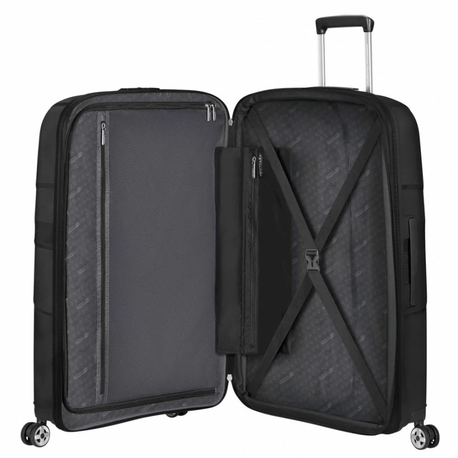 Der American Tourister Starvibe Trolley ist wie für den Urlaub gemacht, denn alleine durch seine fröhliche Erscheinung kommt bereits Ferienstimmung auf. Die Urlaubsutensilien können bequem im zweigeteilten Hauptfach mit integrierten Packriemen, dem Reißverschlussfach auf der Netztrennwand und dem separaten RV-Innenfach untergebracht werden. Falls man einmal noch mehr Platz benötigt, so kann das Volumen dank der Reißverschluss-Dehnfalte bei Bedarf zusätzlich erweitert werden. Für einen angenehmen Reisekomfort sorgen die vier 360-Grad Doppelrollen, die Handgriffe sowie die mehrfach arretierbare Trolleystange. Das Im Koffer integrierte TSA-Zahlenschloss mit frei wählbarer Zahlenkombination (dreistellig), das recycelte Innenmaterial (aus PET-Flaschen) und das strapazierfähige Polypropylen runden den American Tourister Starvibe Trolley ab.