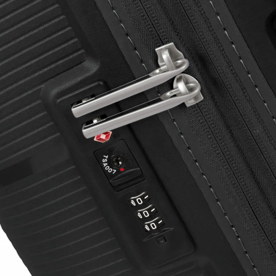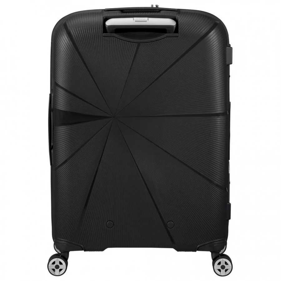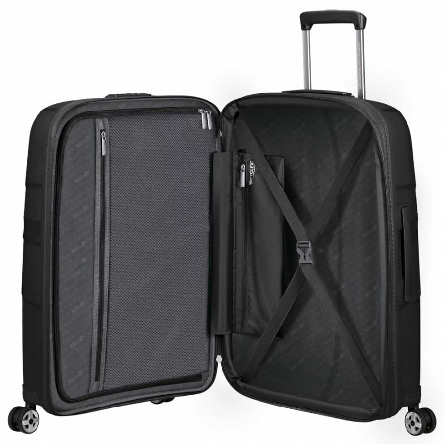 Der American Tourister Starvibe Trolley ist wie für den Urlaub gemacht, denn alleine durch seine fröhliche Erscheinung kommt bereits Ferienstimmung auf. Die Urlaubsutensilien können bequem im zweigeteilten Hauptfach mit integrierten Packriemen, dem Reißverschlussfach auf der Netztrennwand und dem separaten RV-Innenfach untergebracht werden. Falls man einmal noch mehr Platz benötigt, so kann das Volumen dank der Reißverschluss-Dehnfalte bei Bedarf zusätzlich erweitert werden. Für einen angenehmen Reisekomfort sorgen die vier 360-Grad Doppelrollen, die Handgriffe sowie die mehrfach arretierbare Trolleystange. Das Im Koffer integrierte TSA-Zahlenschloss mit frei wählbarer Zahlenkombination (dreistellig), das recycelte Innenmaterial (aus PET-Flaschen) und das strapazierfähige Polypropylen runden den American Tourister Starvibe Trolley ab.