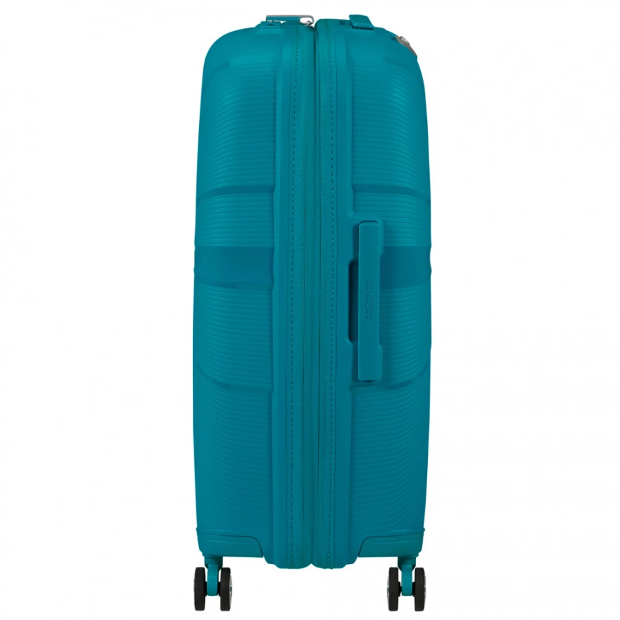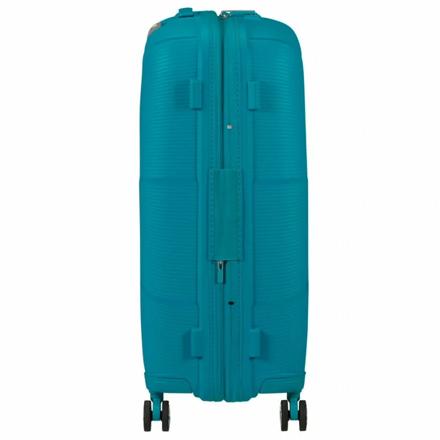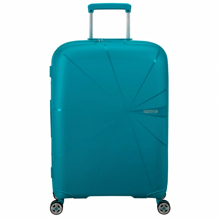 Der American Tourister Starvibe Trolley ist wie für den Urlaub gemacht, denn alleine durch seine fröhliche Erscheinung kommt bereits Ferienstimmung auf. Die Urlaubsutensilien können bequem im zweigeteilten Hauptfach mit integrierten Packriemen, dem Reißverschlussfach auf der Netztrennwand und dem separaten RV-Innenfach untergebracht werden. Falls man einmal noch mehr Platz benötigt, so kann das Volumen dank der Reißverschluss-Dehnfalte bei Bedarf zusätzlich erweitert werden. Für einen angenehmen Reisekomfort sorgen die vier 360-Grad Doppelrollen, die Handgriffe sowie die mehrfach arretierbare Trolleystange. Das Im Koffer integrierte TSA-Zahlenschloss mit frei wählbarer Zahlenkombination (dreistellig), das recycelte Innenmaterial (aus PET-Flaschen) und das strapazierfähige Polypropylen runden den American Tourister Starvibe Trolley ab.
