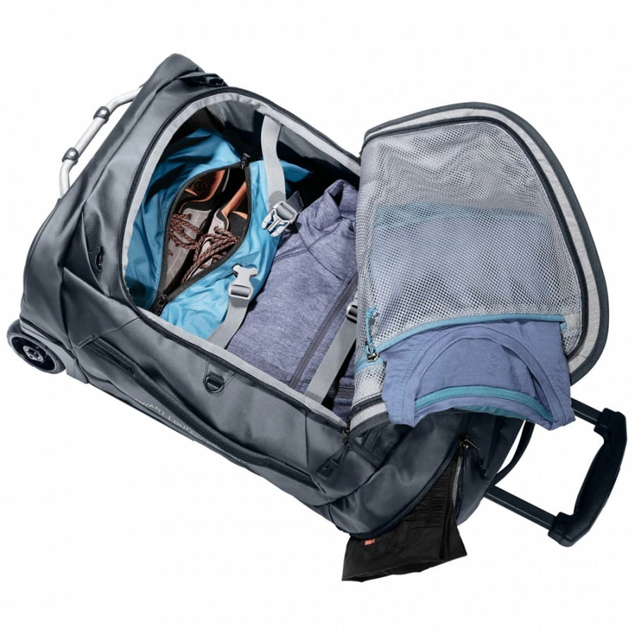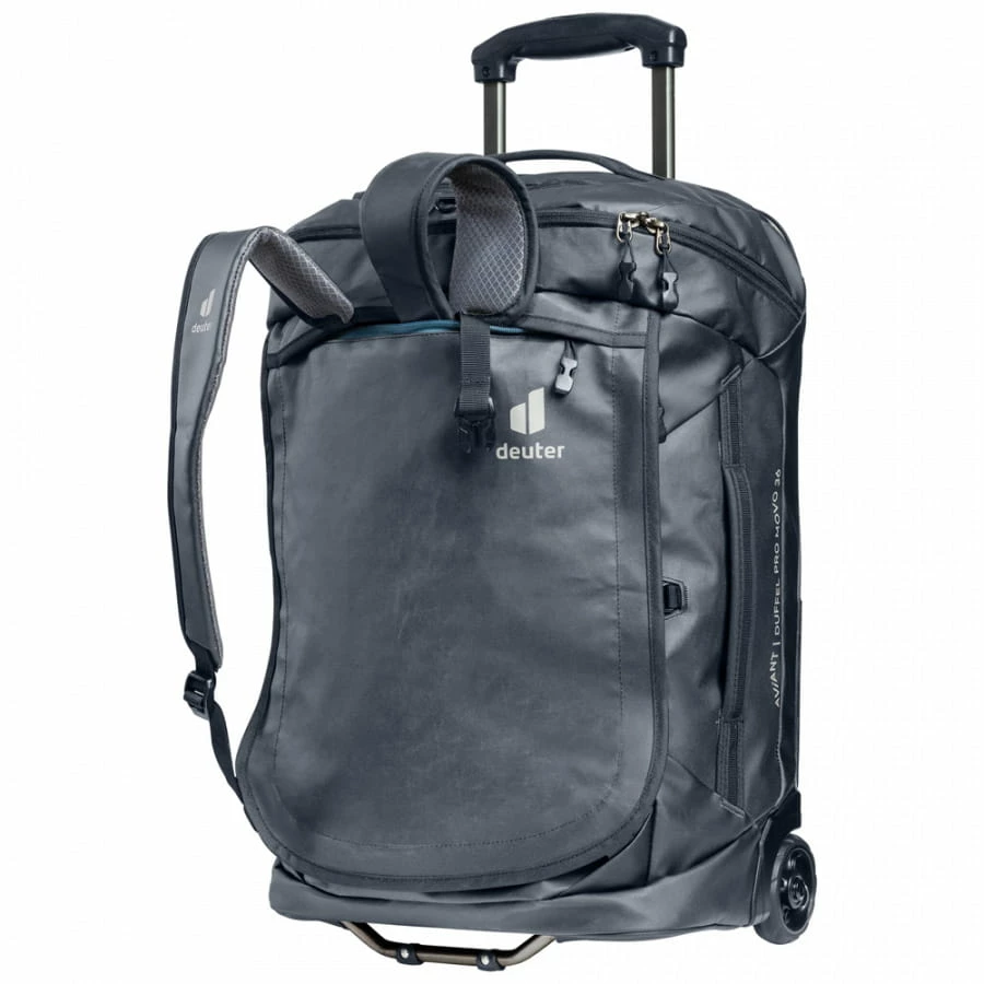Der Deuter Aviant Duffel Pro Movo richtet sich vor Allem an sportliche Abenteurer, die einen wasserfesten und besonders robusten Reisebegleiter suchen. Dies erreicht der Trolley durch seine Bauweise und das verarbeitete Planen-Material (600D PED Coat), welches besonders wasserabweisend und strapazierfähig ist. Die zwei leisen sowie stabilen Rollen, Handgriffe, die mehrfach arretierbare Trolleystange und die verstaubaren Schulterträger (ja, der Trolley kann auch als Rucksack getragen werden) sorgen in jeder Situation sowohl für ein komfortables als auch für ein optimales Handling. Das Hauptfach mit großer Öffnung kann dank eines Fixpunktes mit einem Reißverschluss-Schloss (nicht enthalten) verschlossen werden, besitzt zwei RV-Netzinnentaschen und Packriemen zur Fixierung der Kleidung. Weitere Eigenschaften des Deuter Aviant Duffel Pro Movo 36 sind ein Dokumentenfach, eine weitere RV-Innentasche, ein Wertsachenfach und die geringe Größe (52 x 36 x 27 cm), wodurch er bei den gängigen Fluglinien als Bordgepäck mitgeführt werden kann.