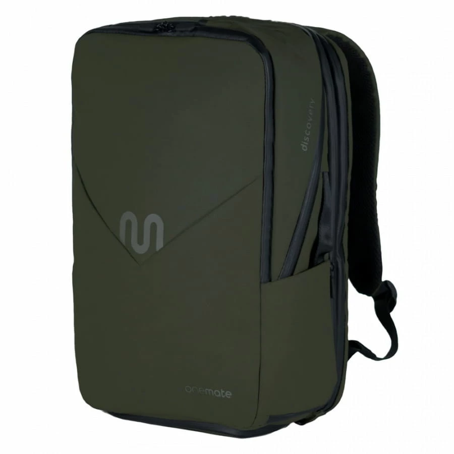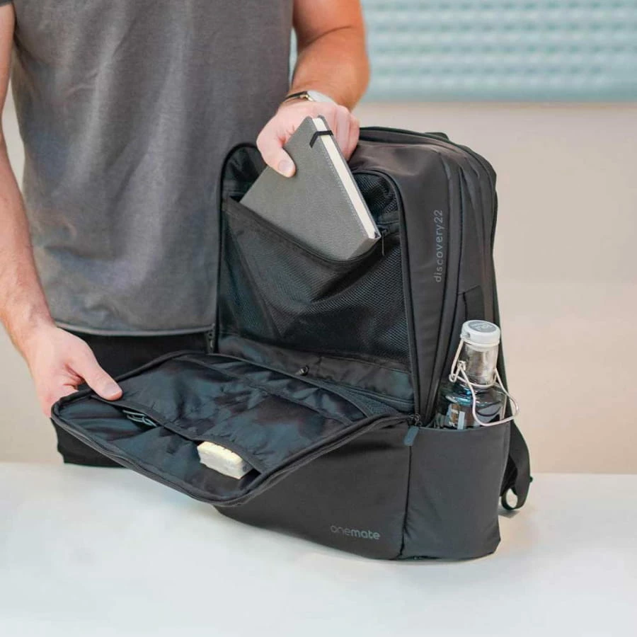Anstatt eines Kabinentrolleys kann man auch Rucksäcke wie den Onemate Discovery als Handgepäck mit in das Flugzeug nehmen. Dieser ist dank des gepolsterten Rückens, der Stufenlos verstellbaren Schultergurte sowie des Brustgurtes besonders komfortabel und flexibel zu transportieren. Die Reiseutensilien lassen sich in den zahlreichen Fächern des großen, auch seitlich aufklappbaren Hauptfaches (welches ähnlich aufgebaut ist wie ein Koffer) unterbringen. Bei Bedarf kann das Volumen des Onemate Discovery Rucksacks dank der Reißverschluss-Dehnfalte auf bis zu 30 Liter erweitert werden. Das verarbeitete Material ist strapazierfähig, leicht zu reinigen und wird aus recycelten PET-Flaschen (ca. 40 Stück) gewonnen.
