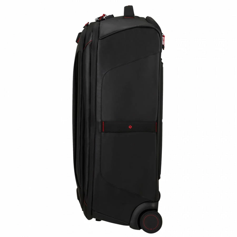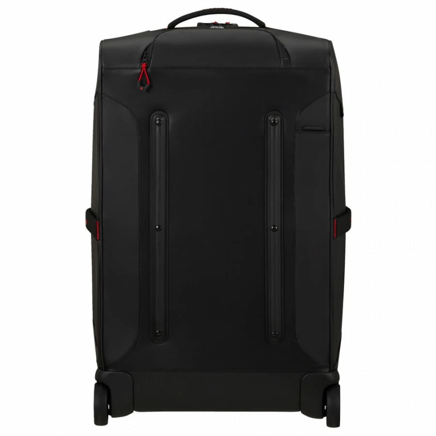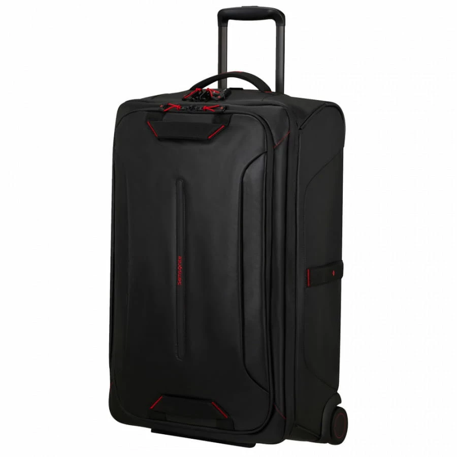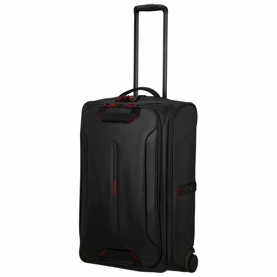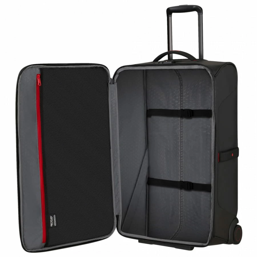 Mit einer Reißverschluss-Außentasche, und dem großen Hauptfach mit integrierten Packriemen sowie einem separaten Netz-Innenfach bietet die Samsonite Ecodiver Rollentasche auf insgesamt 76 Litern Volumen jede Menge Stauraum und Ordnungsmöglichkeiten für Ihre Reise. Transportiert wird sie entweder mithilfe der Handgriffe oder mit der dreifach arretierbaren Trolleystange sowie den beiden leichtläufigen Rollen. Das Material ist besonders wasserabweisend, leicht zu reinigen, strapazierfähig und aus PET-Flaschen recycelt. Ein Adressanhänger beugt Verwechslungen und Verlust vor.