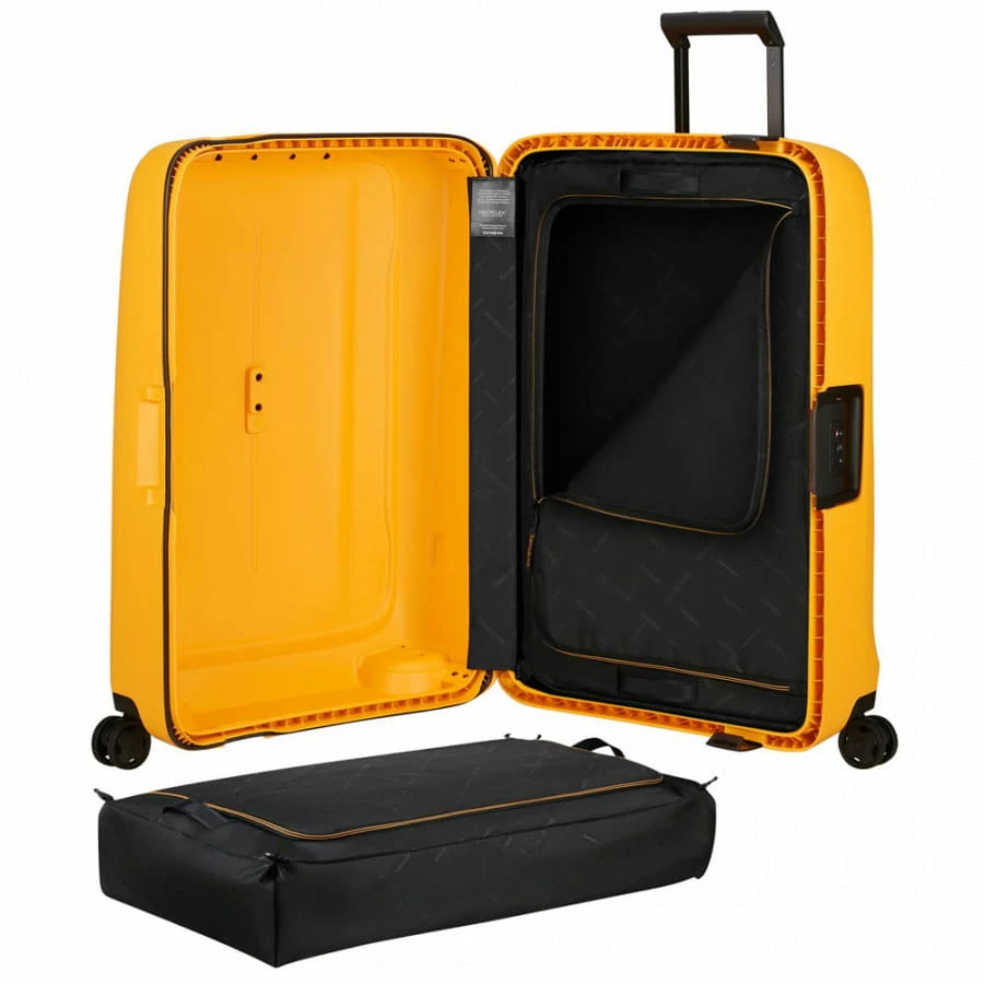 Der Samsonite Essens Trolley ist die perfekte Wahl für Reisende, die Wert auf Stil und Funktionalität legen. Dieser hochwertige Koffer ist mit den neuesten Technologien sowie Materialien ausgestattet und bietet eine robuste und langlebige Lösung für alle Reisebedürfnisse. Das Außenmaterial des Trolleys besteht aus einem leichten aber widerstandsfähigen Polypropylen (70 Prozent recycelt), das gegen Stöße und Kratzer geschützt ist. Das im Inneren verarbeitete Polyester wird aus recycelten PET-Flaschen hergestellt, ist also besonders nachhaltig. Die vier Doppellaufrollen garantieren einfaches Manövrieren, leises Rollen und Stabilität. Die ergonomischen Griffe sorgen für ein bequemes Tragen und das integrierte TSA-Schloss bietet zusätzlichen Schutz für Ihre wertvollen Gegenstände. Innen bietet der Samsonite Essens Trolley viel Stauraum für Ihre Reiseutensilien und zwei Packtaschen (Packfix – per Hand waschbar und mit Tragegriffen), welche herausgenommern werden können. Enthalten sind zudem Design-Sticker, mit welchem der eigene Koffer individualisiert werden kann.