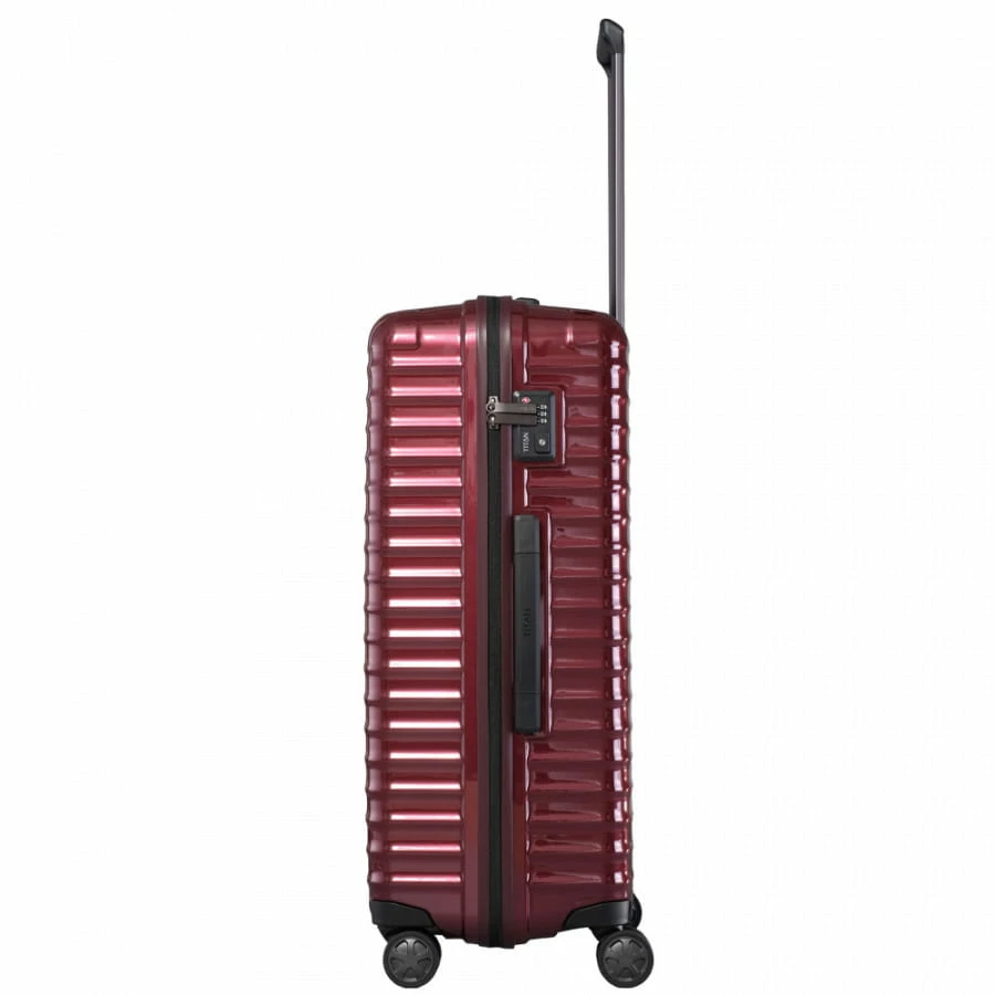 Der in Deutschland hergestellte Titan Litron Trolley L ist ein hochwertiger Trolley, welcher aus besonders widerstandsfähigem Polycarbonat gefertigt ist. Das Innenfutter besteht aus hochwertigem recyceltem Polyester. Durch das schicke und feine Design ist dieser Koffer ein richtiger Eye-Catcher. Über ein Fassungsvermögen von 100 Litern verfügt der Titan Litron Trolley L und bietet somit in Kombination mit zahlreichen Innenfächern endlose Verstaumöglichkeiten. Das integrierte Wäschefach und die Packriemen ermöglichen eine bessere interne Organisation. Mitgeführt lässt er der Koffer mithilfe der arretierbaren Trolleystange und der leichtläüfigen Zwillingsrollen. Die ergonomischen Tragegriffe sind für ein komfortables Tragen verantwortlich. Ein TSA-Schloss mit Zahlenkombination schützt das Reisegepäck vor unbefugtem Zugriff.
