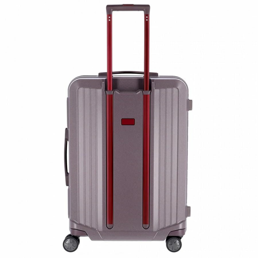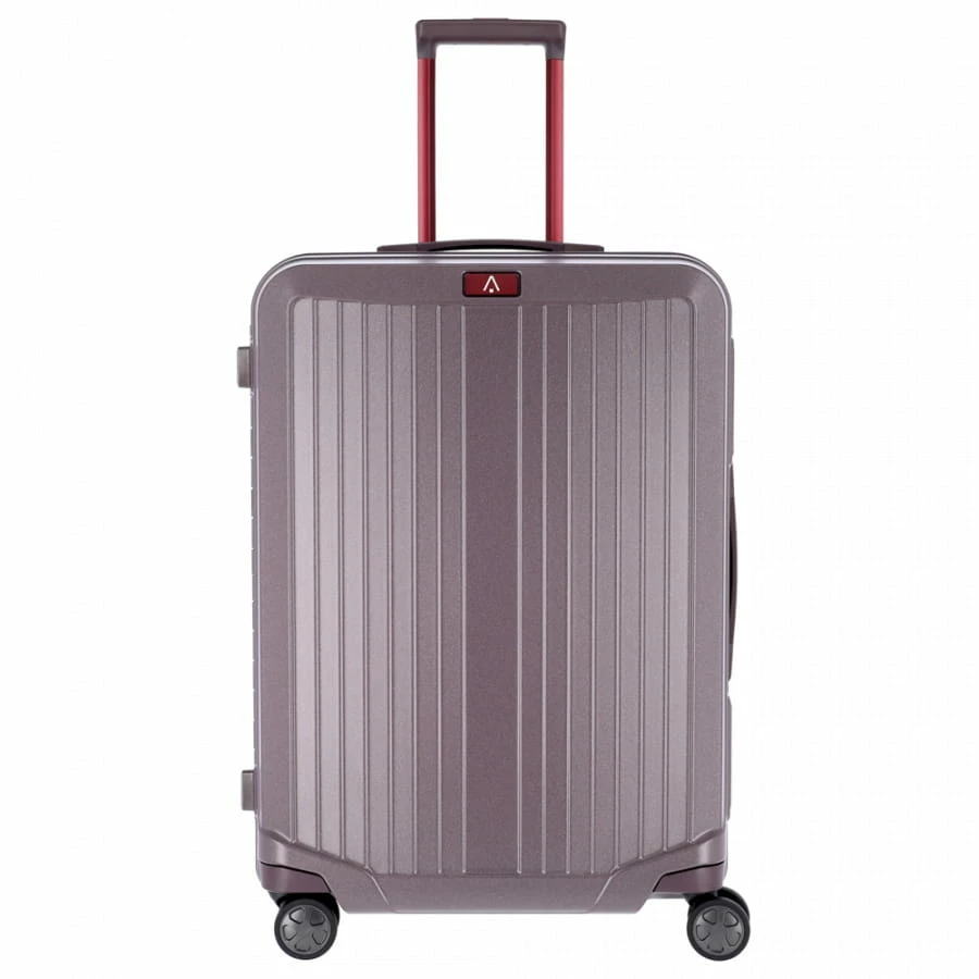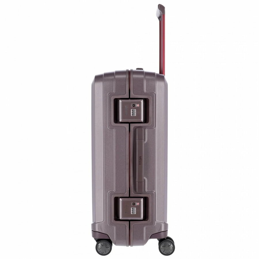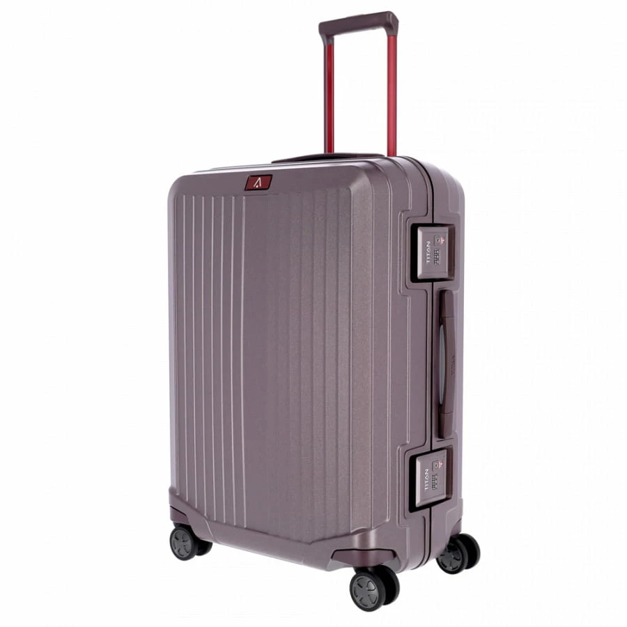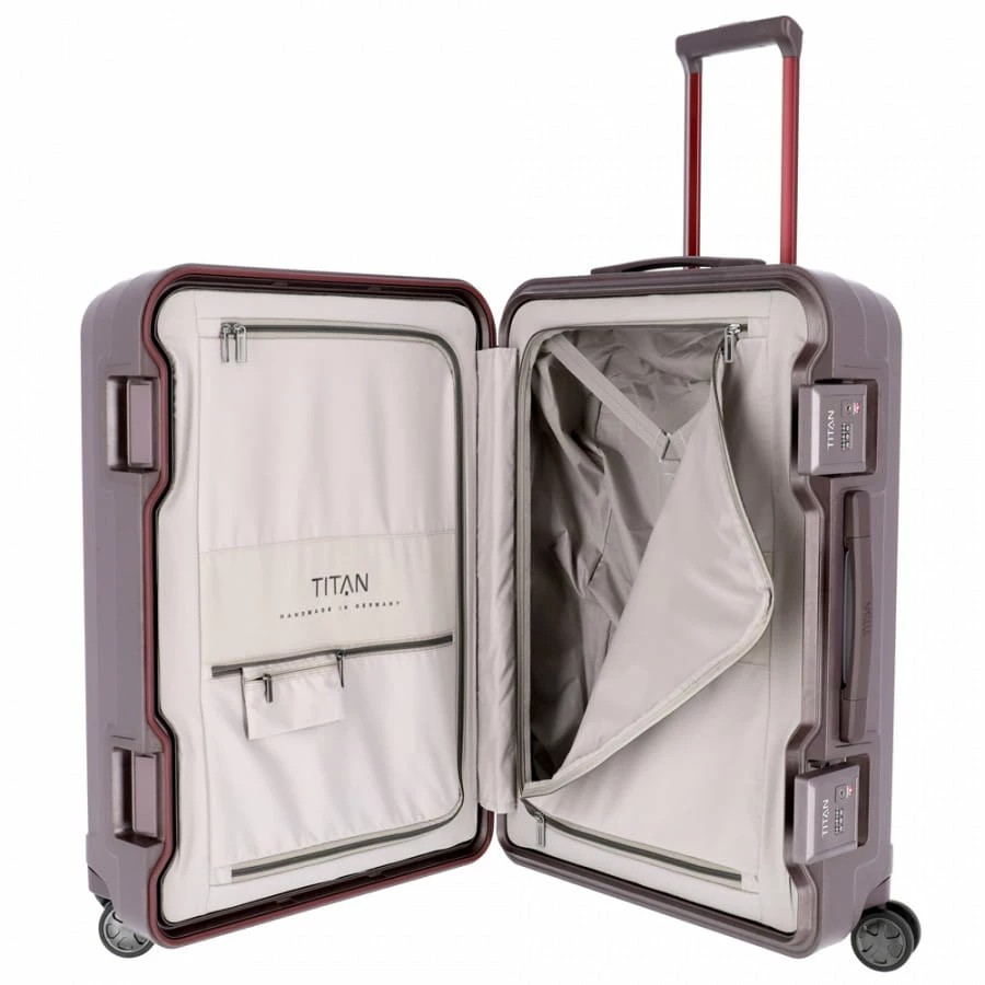 Der Titan Mervus Trolley wird aus besonders hochwertigem Polycarbonat gefertigt, was ihn zum Einen äußerst strapazierfähig macht und zum Anderen für eine sehr edle Optik sorgt. Auch bei allen anderen Materialien wurde auf kurze Transportwege (“Made in Germany”) und eine umweltbewusste Produktion geachtet. Den großen Innenraum des Reisekoffers erreicht man über die beiden Schnappverschlüsse mit integrierten TSA-Zahlenschlössern (dreistellige Kombination frei wählbar). Hier findet man zwei große Innenfächer mit Packriemen, welche durch Reißverschluss-Trennwände voneinander abgetrennt sind. Weitere Innenfächer für Kleinteile runden den Innenraum des Koffers ab. Für einen hohen Transport-Komfort sorgen beim Titan Mervus Trolley die vier Zwillingsrollen, ergonomische Handgriffe und die mehrfach arretierbare Trolleystange.