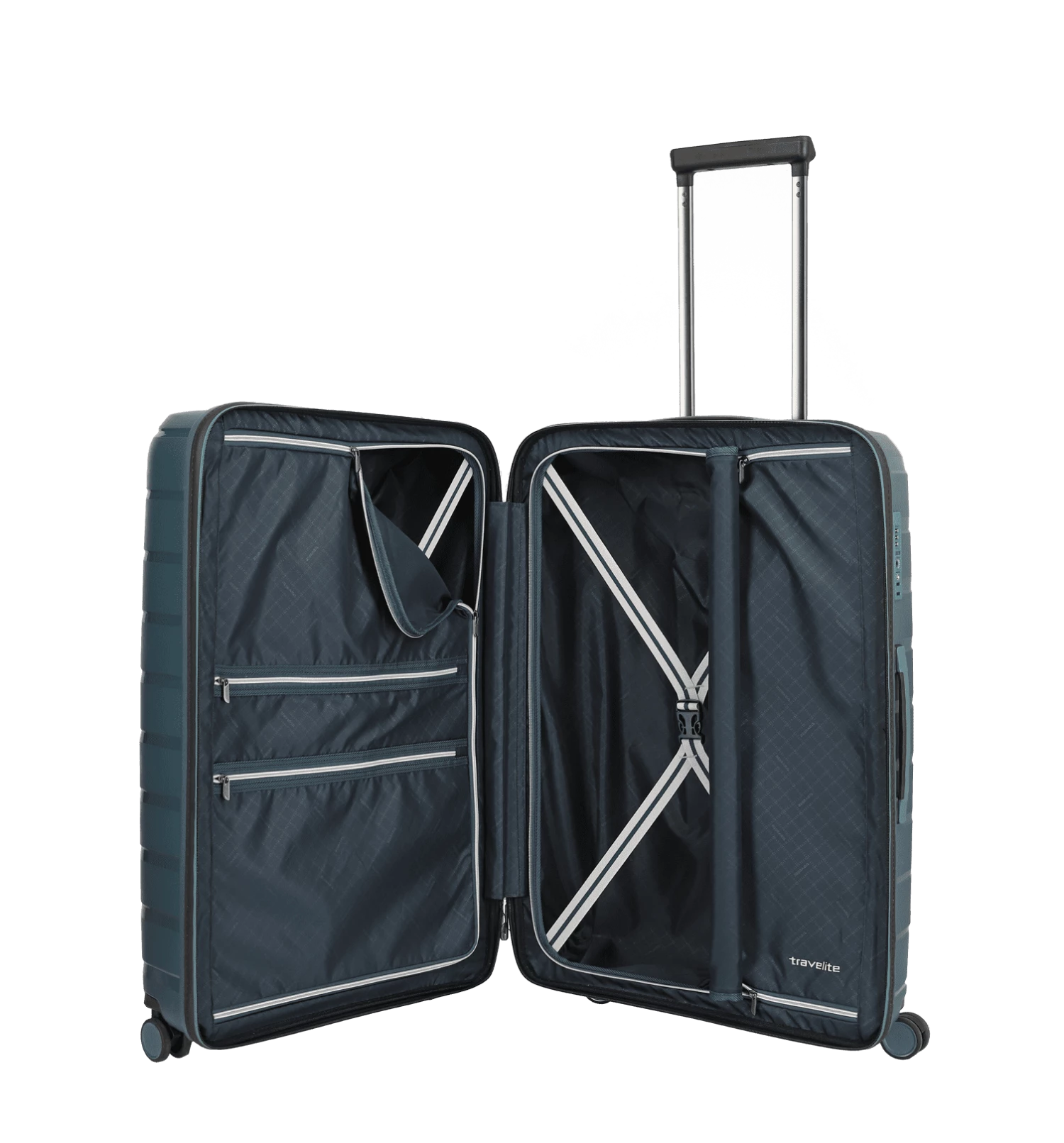 Der Travelite Air Base Trolley besitzt eine einzigartige Oberfläche (Wechselspiel aus glänzender und rauer Oberfläche), einen robusten Korpus aus nahezu unverwüstlichen Polypropylen und zahlreiche nützliche Funktionen. Zu Letzteren gehören das dreistellige TSA-Zahlenschloss (Kombination frei wählbar), das große Hauptfach, die integrierten Packriemen, das separate Wäschefach und die RV-Innenfächer. Vier laufruhige 360-Grad Zwillingsrollen, eine mehrfach arretierbare Trolleystange und die ergonomischen Tragegriffe sorgen für ein angenehmes sowie komfortables Handling des Travelite Air Base Trolley.