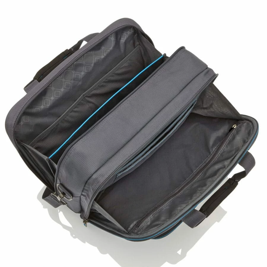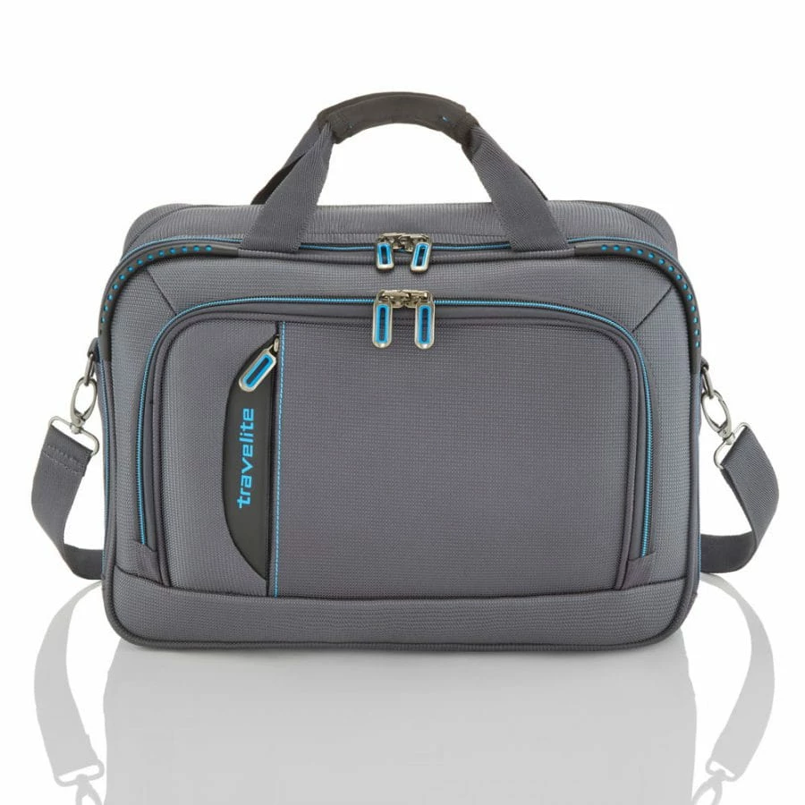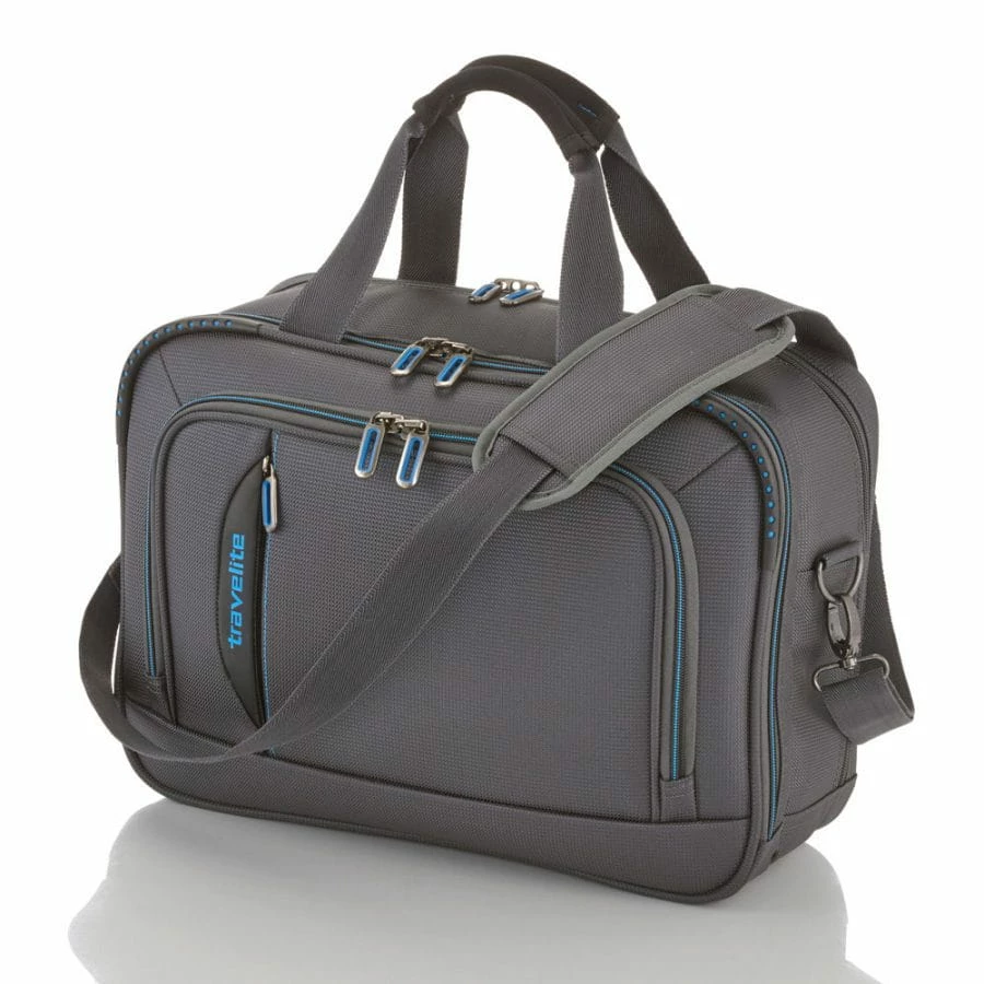Die Bordtasche Crosslite von Travelite verfügt über einen großen Packraum mit integriertem Notebookfach als Hauptfach und zwei schmale Reißverschlussfächer (eines mit Organizer) für einzelne Unterlagen und Arbeitsutensilien an der Vorderseite. Getragen werden kann die Bordtasche an zwei Handgriffen oder an einem abnehmbaren Schultergurt. Die Travelite Crosslite Bordtasche lässt sich bequem auf jedes Trolley Gestänge aufstecken.