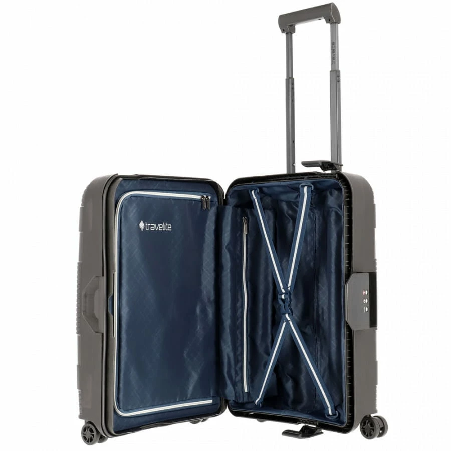 Der Travelite Korfu Trolley ist der ideale Koffer, wenn Sie einen sicheren Reisebegleiter zum kleinen Preis suchen. Er wird aus hochwertigem sowie besonders widerstandsfähigem Polypropylen hergestellt wodurch ihm auch der schlimmste Flughafenverkehr nichts anhaben kann. Das Innere erreicht man über die drei Klappverschlüsse mit Absenkautomatik, von welchen eines über ein integriertes TSA Zahlenschloss verfügt. Packriemen, eine RV-Trennwand und ein weiteres Wäschefach sorgen für einen gut sortierten Stauraum. Für einen angenehmen Tragekomfort sorgen beim Travelite Korfu die vier Zwillingsrollen, ein Handgriff und die mehrfach arretierbare Trolleystange.